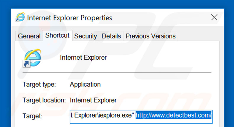 This browser hijacker changes the "Target" field of the Internet Explorer shortcut. To fix this, locate the shortcut on your Desktop and click the right mouse button over it. In the opened menu, choose "Properties". In the opened window, locate the Target field and eliminate text (hxxp://www.detectbest.com/...), which is entered after "C:\Program Files\Internet Explorer\iexplore.exe".