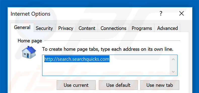 (at the top right corner of Internet Explorer), select "Internet Options", in the opened window, remove hxxp://search.searchquicks.com and enter your preferred domain, which will open each time you launch Internet Explorer. You can also enter about: blank to open a blank page when you start Internet Explorer.