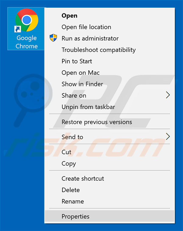This browser hijacker modifies the "Target" field of the Google Chrome shortcut. To fix this, locate the shortcut on your Desktop and click the right mouse button over it. In the opened menu, choose "Properties". In the opened window, locate the Target field and eliminate all text (hxxp://www.foxsearch.me/...), which is entered after "C:\Program Files\Google\Chrome\Application\chrome.exe"