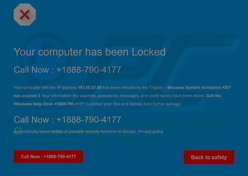 Your computer with the IP address - has been infected by the Trojans - Because System Activation KEY has expired & Your information (for example, passwords, messages, and credit cards) have been stolen. Call the Windows Help Desk +1888-790-4177 to protect your files and identity from further damage.