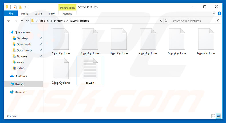 For example, "sample.jpg" is renamed to "sample.jpg.Cyclone". Once files are encrypted, they become unusable. Immediately after encryption, Cyclone opens a pop-up window and places a "key.txt" file in every existing folder.