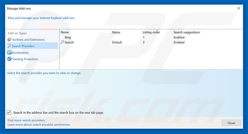 (at the top right corner of Internet Explorer), select "Manage Add-ons". In the opened window, select "Search Providers", set "Google", "Bing", or any other preferred search engine as your default and then remove "gatmog".