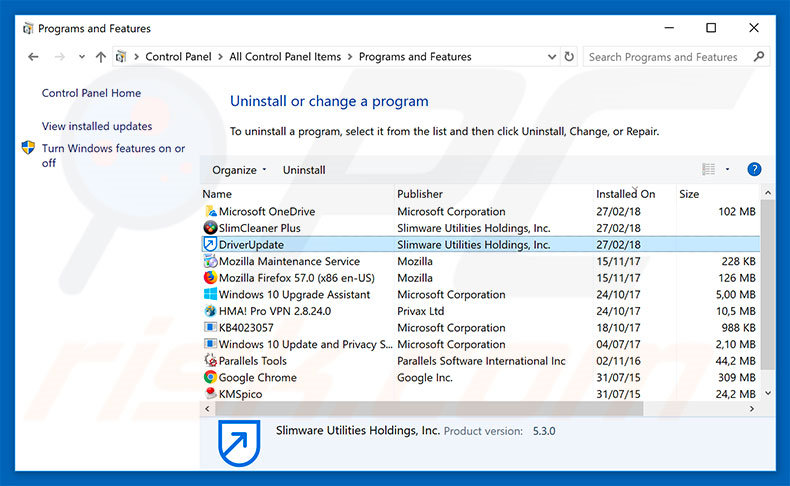 In the uninstall programs window, look for "DriverUpdate", select this entry and click "Uninstall" or "Remove".