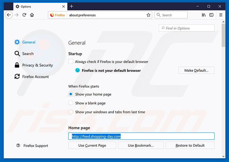 (at the top right corner of the main window), then select "Options", in the opened window, remove hxxp://feed.shopping-day.com and enter your preferred domain, which will open each time you start Mozilla Firefox.