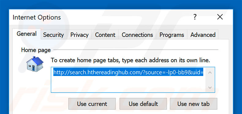 (at the top right corner of Internet Explorer), select "Internet Options", in the opened window, remove hxxp://search.hthereadinghub.com and enter your preferred domain, which will open each time you launch Internet Explorer. You can also enter about: blank to open a blank page when you start Internet Explorer.