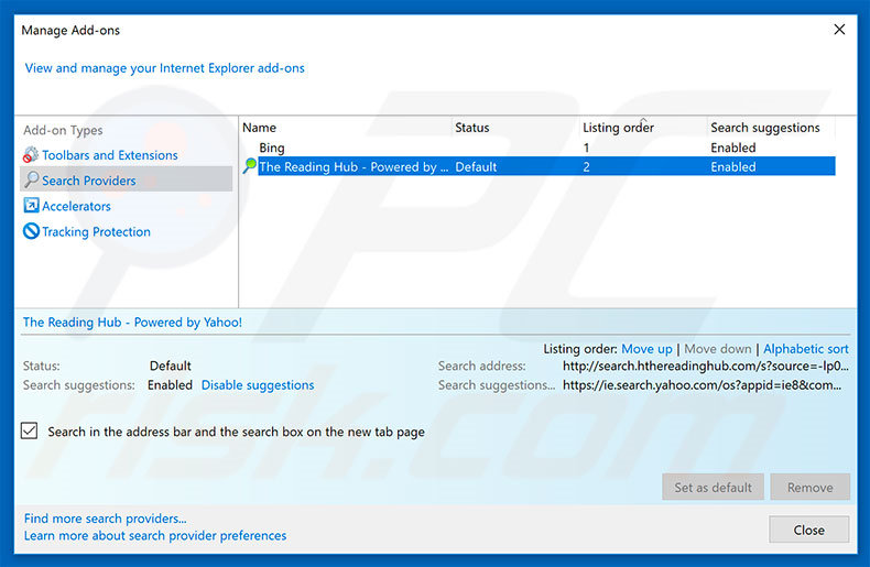 (at the top right corner of Internet Explorer), select "Manage Add-ons". In the opened window, select "Search Providers", set "Google", "Bing", or any other preferred search engine as your default and then remove "The Reading Hub...".