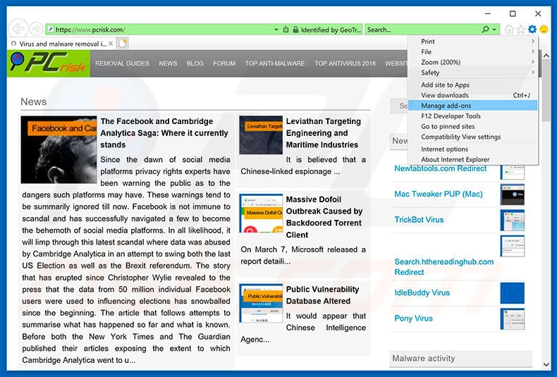 (at the top right corner of Internet Explorer), select "Manage Add-ons". Look for any recently-installed suspicious browser extensions, select these entries and click "Remove".