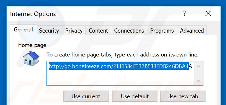 (at the top right corner of Internet Explorer), select "Internet Options", in the opened window remove hxxp://go.bonefreeze.com and enter your preferred domain, which will open each time you launch Internet Explorer. You can also enter about: blank to open a blank page when you start Internet Explorer.