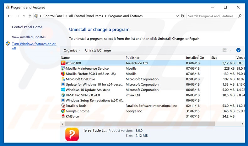In the uninstall programs window: look for any recently installed suspicious applications (for example, "Bonefreeze"), select these entries and click "Uninstall" or "Remove".