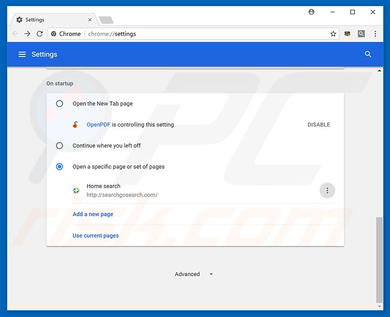 (at the top right corner of Google Chrome), select "Settings". In the "On startup" section, look for a browser hijacker URL (hxxp://www.searchgosearch.com) below the “Open a specific or set of pages” option. If present, click the three vertical dots icon and select “Remove”.