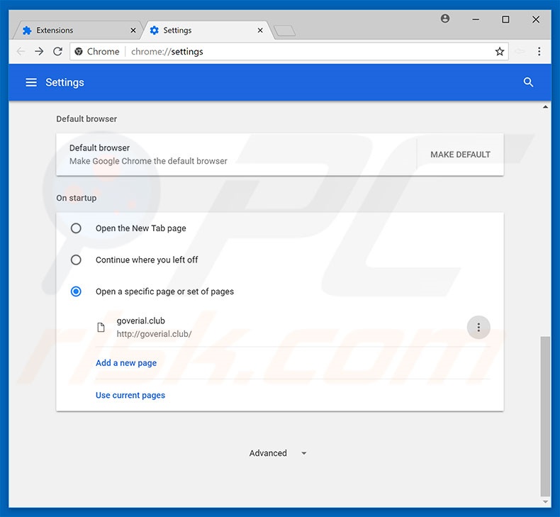 (at the top right corner of Google Chrome), select "Settings". In the "On startup" section, look for a browser hijacker URL (hxxp://www.goverial.club) below the “Open a specific or set of pages” option. If present, click the three vertical dots icon and select “Remove”.