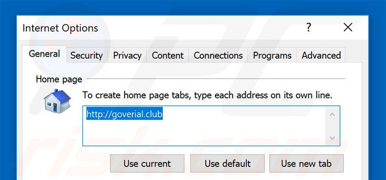 (at the top right corner of Internet Explorer), select "Internet Options", in the opened window, remove hxxp://goverial.club and enter your preferred domain, which will open each time you launch Internet Explorer. You can also enter about: blank to open a blank page when you start Internet Explorer.