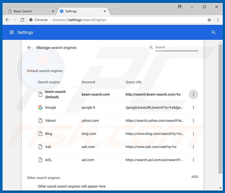 (at the top right corner of Google Chrome), select "Settings", in the "Search engine" section, click "Manage search engines...", in the opened list, look for "beam-search" and when located, click the three vertical dots near this URL and select "Remove from list".
