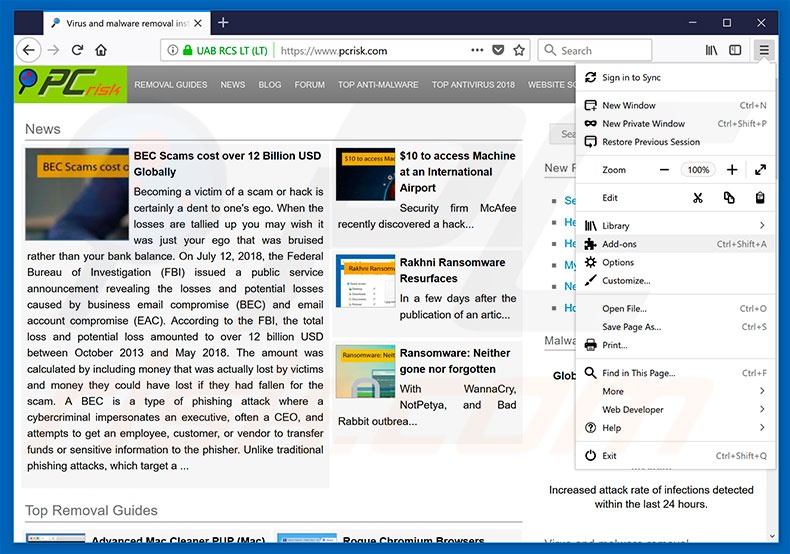 (at the top right corner of the main window), select "Add-ons". Click "Extensions", in the opened window, remove all recently-installed suspicious browser plug-ins.