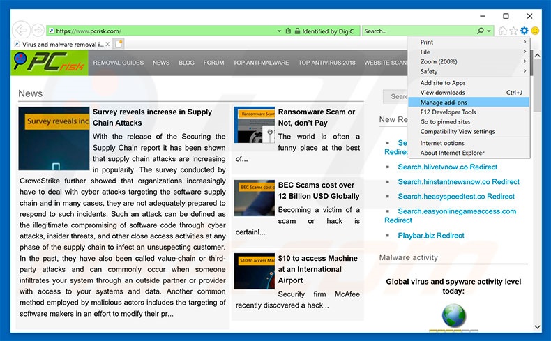 (at the top right corner of Internet Explorer), select "Manage Add-ons". Look for any recently-installed suspicious browser extensions, select these entries and click "Remove".