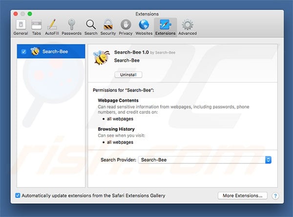 In the preferences window, select "Extensions" and look for any recently-installed suspicious extensions. When located, click the "Uninstall" button next to it/them. Note that you can safely uninstall all extensions from your Safari browser - none are crucial for regular browser operation.