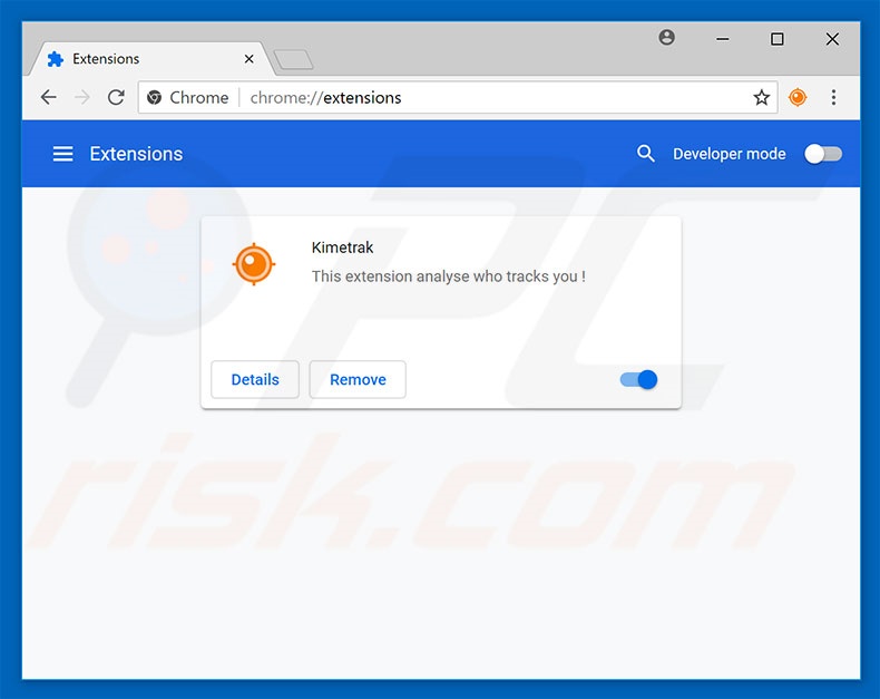 (at the top right corner of Google Chrome), select "More tools" and click "Extensions". Locate "Kimetrak", select this entry and click the trash can icon.