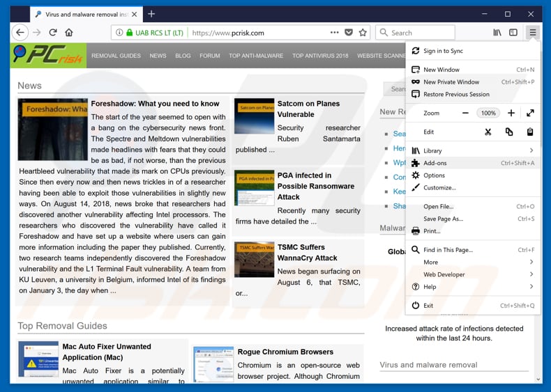 (at the top right corner of the main window), select "Add-ons". Click "Extensions", in the opened window, remove all recently-installed suspicious browser plug-ins.