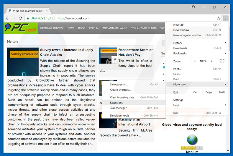(at the top right corner of Google Chrome), select "More tools" and click "Extensions". Locate all recently-installed suspicious browser add-ons and remove them.