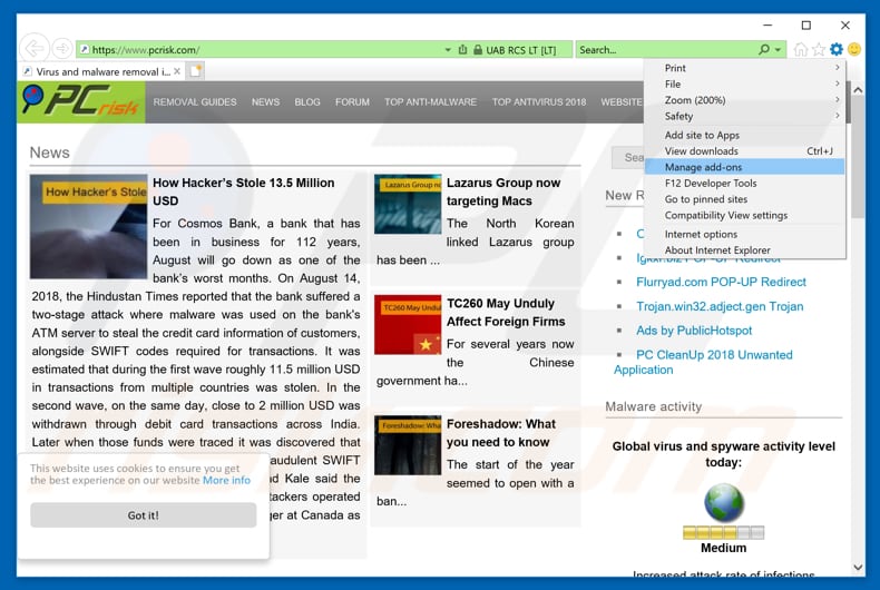 (at the top right corner of Internet Explorer), select "Manage Add-ons". Look for any recently-installed suspicious browser extensions, select these entries and click "Remove".