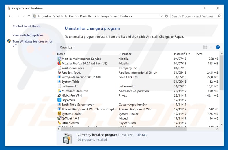 In the uninstall programs window, look for any potentially unwanted applications, select these entries and click "Uninstall" or "Remove".