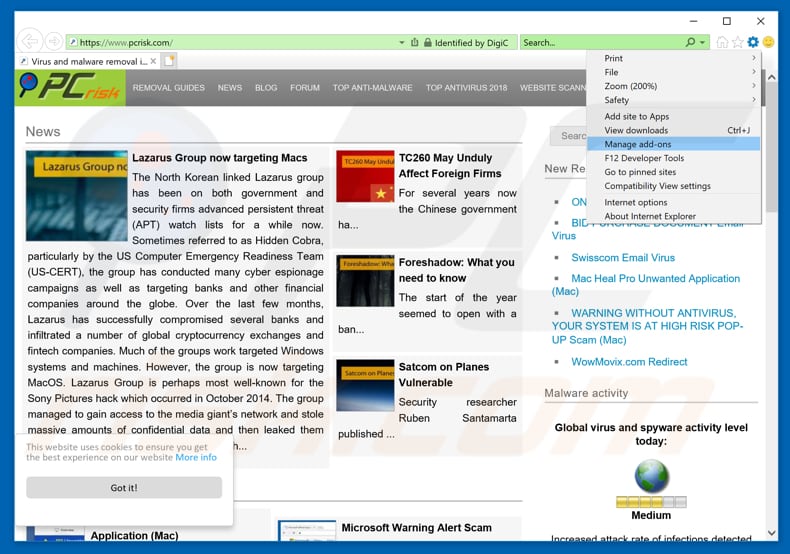 (at the top right corner of Internet Explorer), select "Manage Add-ons". Look for any recently-installed suspicious browser extensions, select these entries and click "Remove".