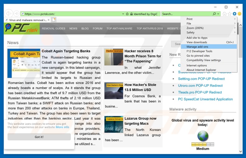 (at the top right corner of Internet Explorer), select "Manage Add-ons". Look for any recently-installed suspicious browser extensions, select these entries and click "Remove".