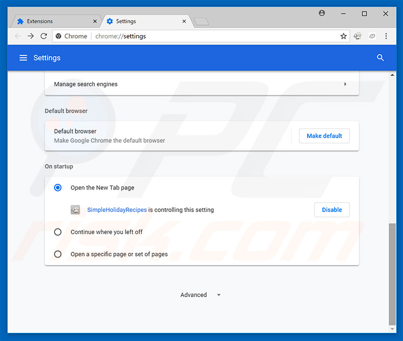 (at the top right corner of Google Chrome), select "Settings". In the "On startup" section, disable "SimpleHolidayRecipes", look for a browser hijacker URL (hp.myway.com) below the “Open a specific or set of pages” option. If present, click on the three vertical dots icon and select “Remove”.