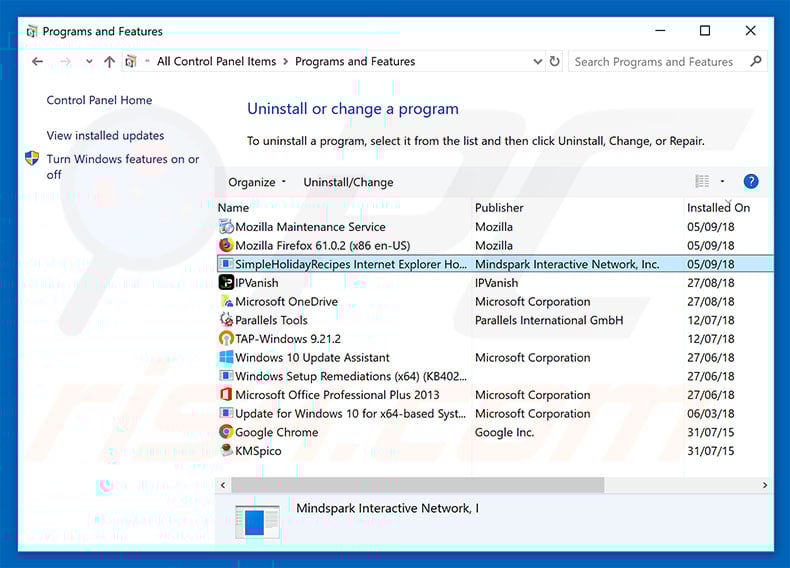 In the uninstall programs window: look for any recently installed suspicious applications (for example, "SimpleHolidayRecipes Internet Explorer..."), select these entries and click "Uninstall" or "Remove".