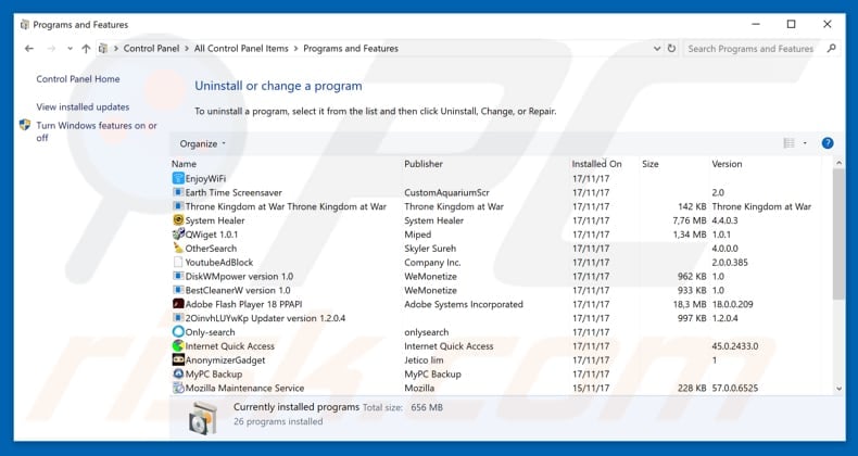 Also ensure that there are no unknown or unwanted programs installed on your computer. If your computer is already infected with rogue applications, we recommend running a scan with Combo Cleaner Antivirus for Windows to automatically eliminate them.