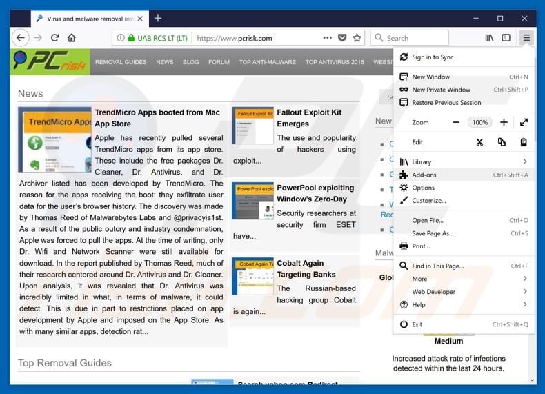 (at the top right corner of the main window), select "Add-ons". Click "Extensions", in the opened window, remove all recently-installed suspicious browser plug-ins.