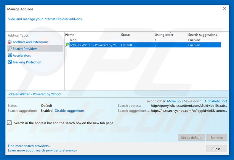 (at the top right corner of Internet Explorer), select "Manage Add-ons". In the opened window, select "Search Providers", set "Google", "Bing", or any other preferred search engine as your default and then remove "Lokales Wetter...".