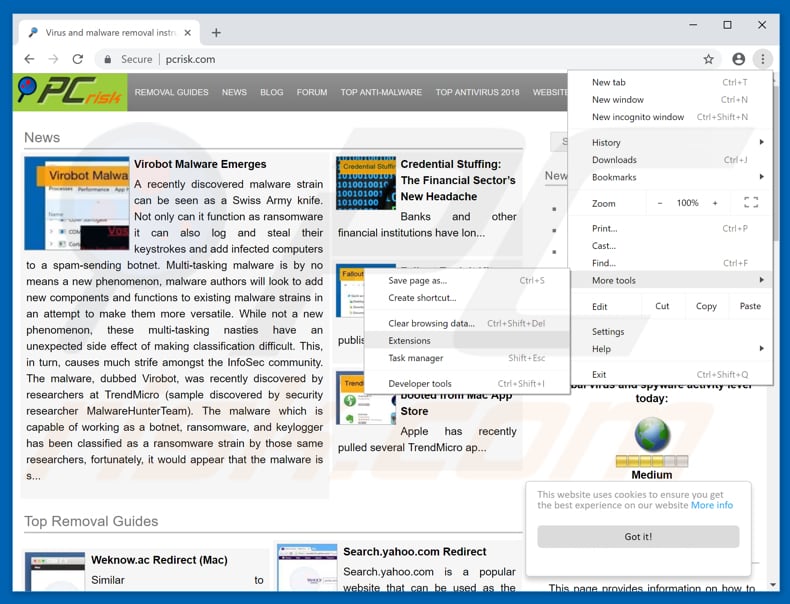 (at the top right corner of Google Chrome), select "More tools" and click "Extensions". Locate all recently-installed suspicious browser add-ons and remove them.