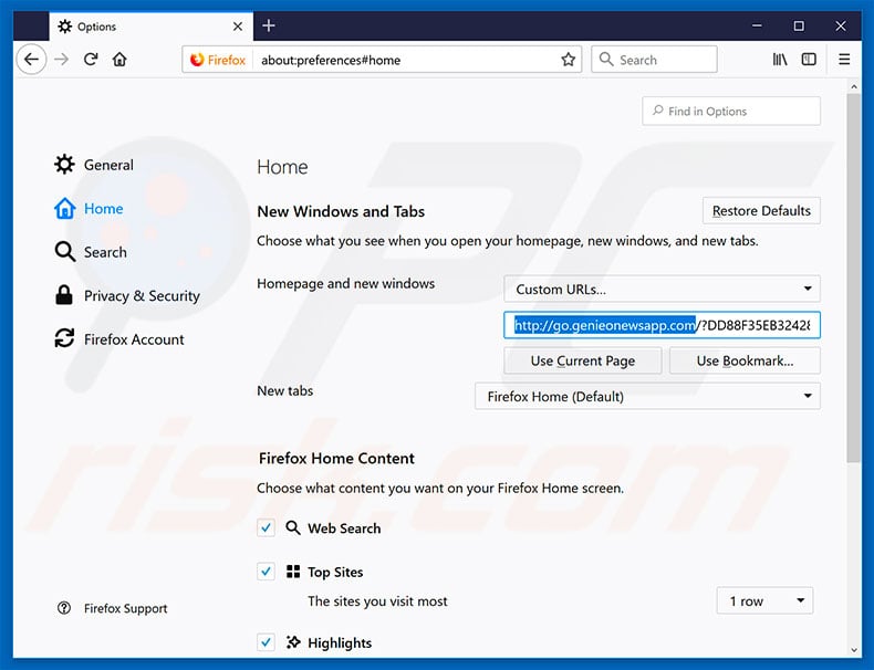 (at the top right corner of the main window), then select "Options", in the opened window, remove hxxp://go.genieonewsapp.com and enter your preferred domain, which will open each time you start Mozilla Firefox.