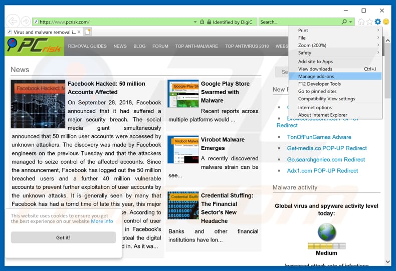 (at the top right corner of Internet Explorer), select "Manage Add-ons". Look for any recently-installed suspicious browser extensions, select these entries and click "Remove".
