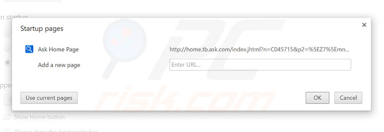 (at the top right corner of Google Chrome), select "Settings". In the "On startup" section, look for a browser hijacker URL (hxxp://www.home.tb.ask.com) below the “Open a specific or set of pages” option. If present, click on the three vertical dots icon and select “Remove”.