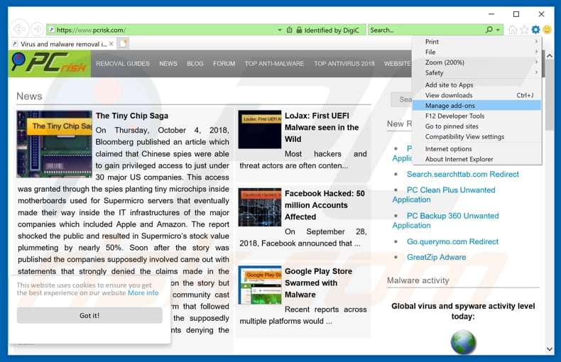 (at the top right corner of Internet Explorer), select "Manage Add-ons". Look for any recently-installed suspicious browser extensions, select these entries and click "Remove".