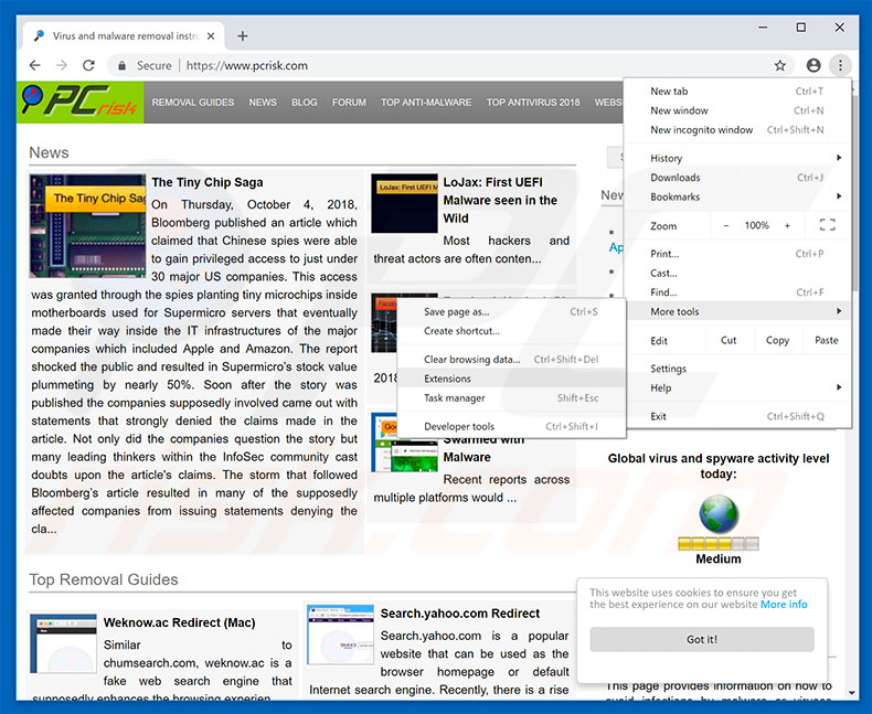 (at the top right corner of Google Chrome), select "More tools" and click "Extensions". Locate all recently-installed suspicious browser add-ons and remove them.
