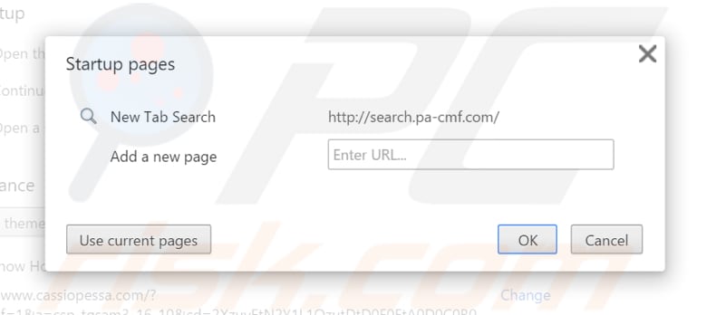 (at the top right corner of Google Chrome), select "Settings". In the "On startup" section, look for a browser hijacker URL (hxxp://www.search.pa-cmf.com) below the “Open a specific or set of pages” option. If present, click on the three vertical dots icon and select “Remove”.