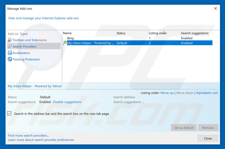 (at the top right corner of Internet Explorer), select "Manage Add-ons". In the opened window, select "Search Providers", set "Google", "Bing", or any other preferred search engine as your default and then remove "search-story".