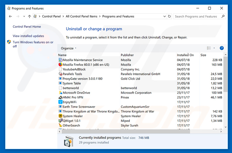 In the uninstall programs window, look for any potentially unwanted applications, select these entries and click "Uninstall" or "Remove".