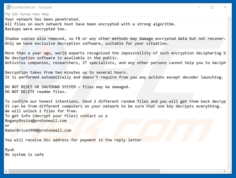 They urge people not to delete or rename the "RyukReadMe.txt" text files. RYK developers offer free decryption of two files to prove decryption is possible and in an attempt to give the impression that they can be trusted.