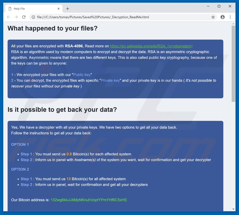 As mentioned, the "_Decryption_ReadMe.html" HTML file contains instructions about how to contact cyber criminals, make payment, and so on. It states that RobbinHood encrypted files with the RSA-4096 cryptography algorithm. To acquire a decryption tool (key), ransomware victims must pay 0.8 or 13 Bitcoins using a Bitcoin wallet address presented in the HTML file.