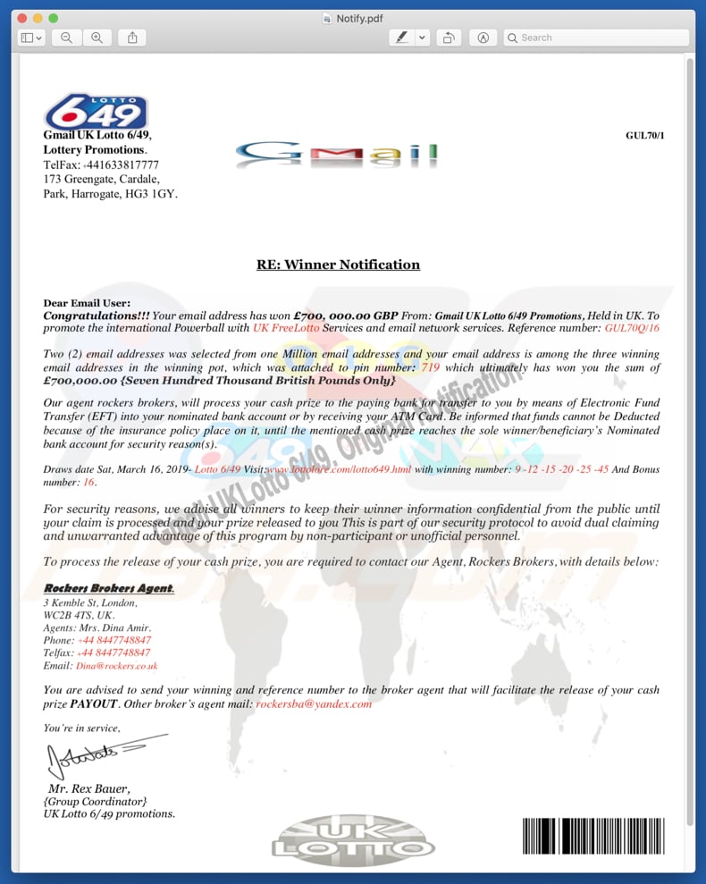 An example is "Gmail UK Lotto 6/49". This scam attempts to trick recipients into believing that their email addresses were selected as winners of a significant sum of money (£700,000.00). In this case, they are encouraged to claim their prize by contacting "agents" via the email address or telephone numbers provided.