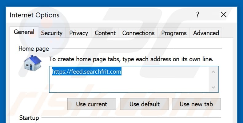(at the top right corner of Internet Explorer), select "Internet Options", in the opened window, remove hxxp://feed.searchfrit.com and enter your preferred domain, which will open each time you launch Internet Explorer. You can also enter about: blank to open a blank page when you start Internet Explorer.