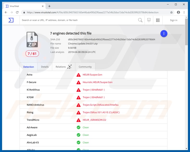 | Detections | Avira (HEUR/Suspar.Gen), F-Secure (Heuristic.HEUR/Suspar.Gen), TrendMicro (HEUR_JSRANSOM.O2). |