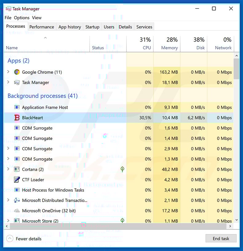 Screenshot of Prodecryptor process ("BlackHeart") in Windows Task Manager: