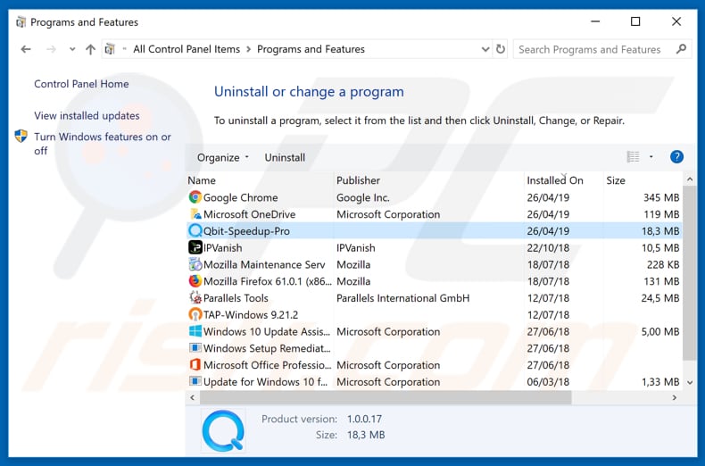 In the uninstall programs window, look for "Qbit Speedup Pro" (or "Qbit-Speedup-Pro") and other suspicious/recently-installed applications, select these entries and click "Uninstall" or "Remove".