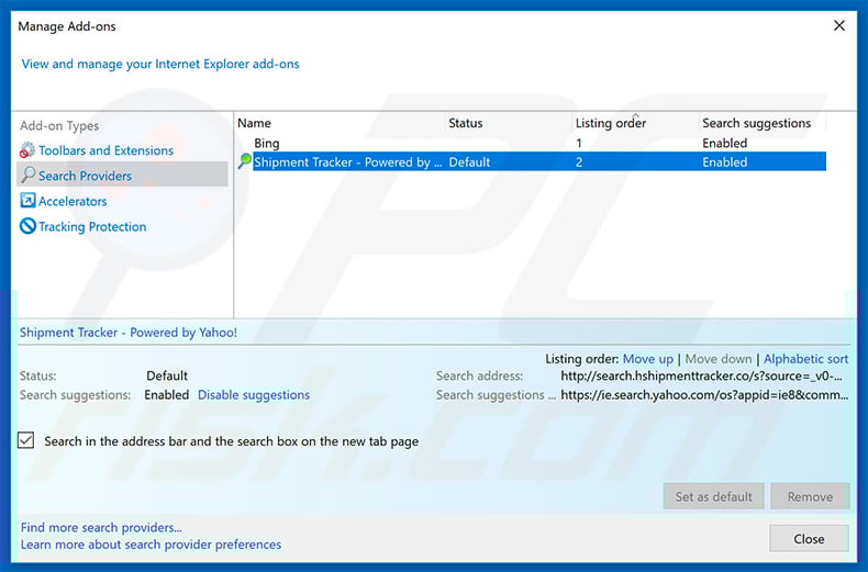 (at the top right corner of Internet Explorer), select "Manage Add-ons". In the opened window, select "Search Providers", set "Google", "Bing", or any other preferred search engine as your default and then remove "Shipment Tracker".