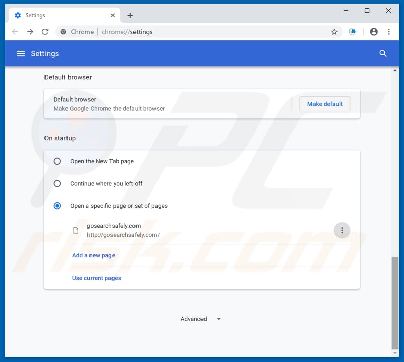 (at the top right corner of Google Chrome), select "Settings". In the "On startup" section, disable "Private Browsing by Safely", look for a browser hijacker URL (hxxp://www.gosearchsafely.com) below the “Open a specific or set of pages” option. If present, click on the three vertical dots icon and select “Remove”.